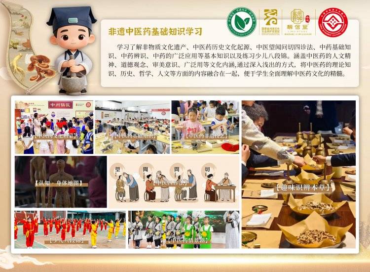 依托国家级河洛文化生态实验保护区“非遗传承馆”和“非遗工坊”;通 过历史传承、工艺展示,参观麟信堂中医药非遗研学实践教育基地,动手体验 中药扎染、中药制香、中药膏贴、中药面膜等非遗中医药等活动,让学生了解 传统膏药、中药面膜发展史、制作技艺、中医药历史发展、传统中药材炮制方 法、中药材药理药性等,汲取中国五千年传统中医药文化精髓,让学生了解传 统膏药、中药面膜的制作工艺和方法,促进传统中医药文化的繁荣复兴,推动 传统中医药行业的创新发展。