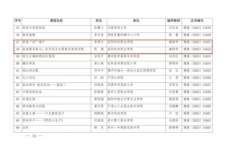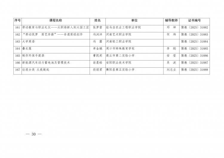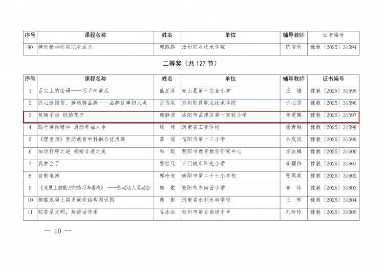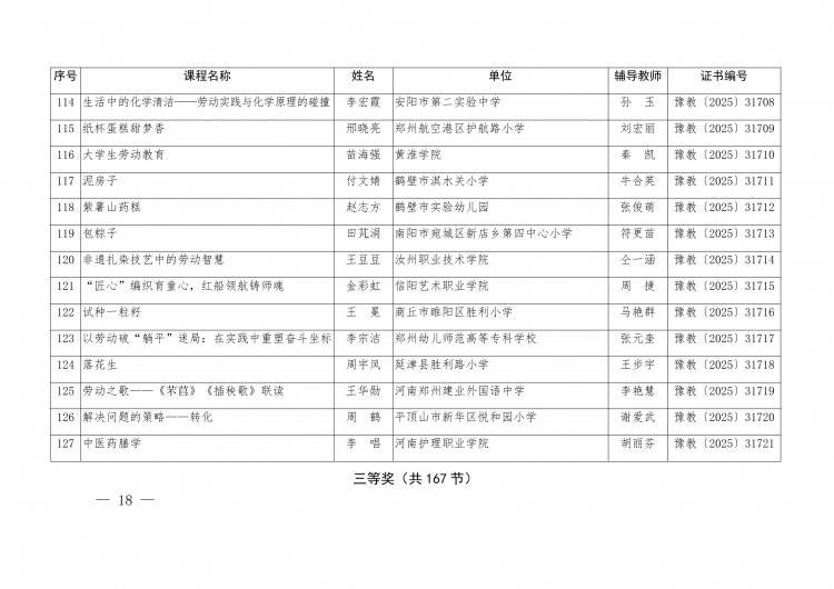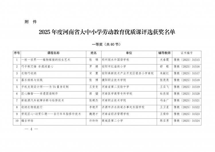 根据《河南省教育厅办公室关于开展2025年度河南省大中小学劳动教育优质课评选活动的通知》(教办体卫艺〔2025〕96号)精神,省教育厅组织举办了2025年度河南省大中小学劳动教育优质课评选活动。经各省辖市、各学校审核推荐、网络评审、现场决赛、网上公示等环节,共评出一等奖80节、二等奖127节、三等奖167节。现将获奖名单予以公布(见附件)。