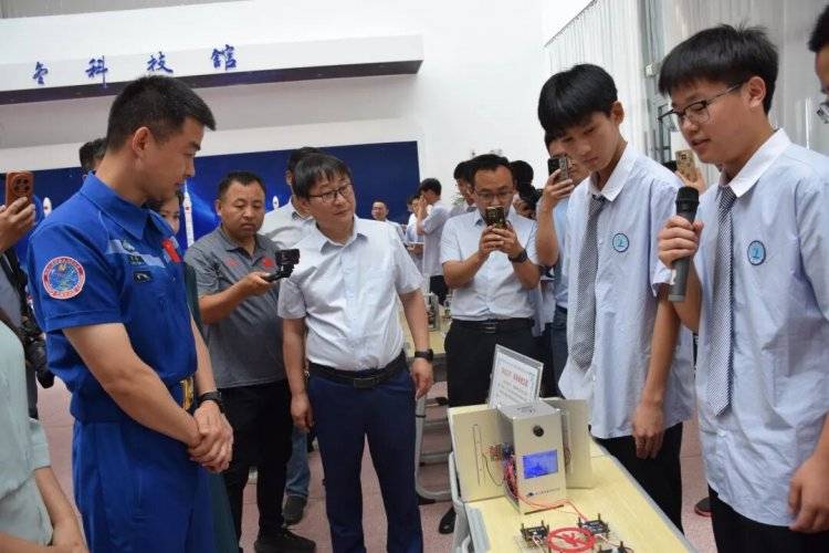 英雄航天员陈冬在洛阳市第二高级中学陈冬科技馆与学弟学妹们互动交流。