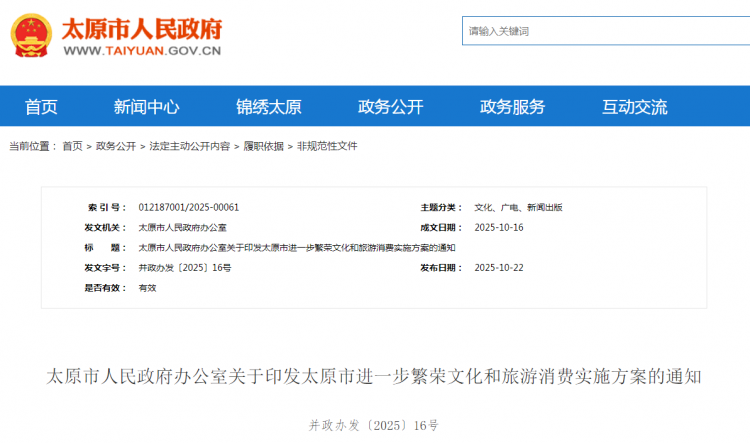 近日,太原市人民政府办公室印发《太原市进一步繁荣文化和旅游消费实施方案》(以下简称《方案》)。