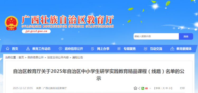 12月12日,广西壮族自治区教育厅发布《自治区教育厅关于2025年自治区中小学生研学实践教育精品课程(线路)名单的公示》,评选出《虫虫特工队 探秘昆虫世界——广西自然生态研学课程》等9门精品课程、《硬核柳州·匠心传承》等6条精品线路。