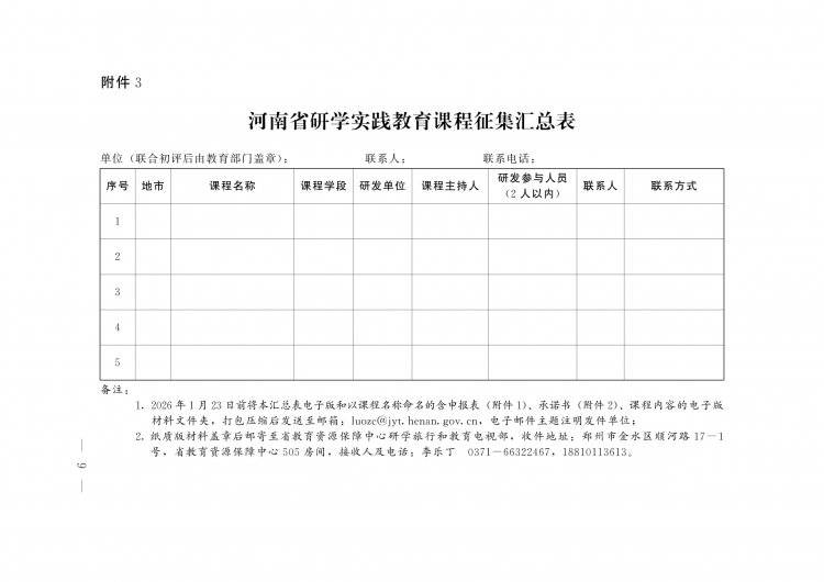 1.请于2026年1月23日前将包含申报表 (附件1)、承诺书 (附件2)、课程内容的电子版材料放置于同一文件夹 (以课程名称命名),和汇总表电子版 (附件3)一并打包发送至邮箱luozc@jyt.henan.gov.cn,纸质版材料邮寄至河南省教育资源保障中心研学旅行和教育电视部 (若课程附件过大可拷贝 U 盘随纸质版材料邮寄),收件地址:郑州市金水区顺河路17-1号,省教育资源保障中心505房间,接收人及电话:李乐丁 0371-66322467,18810113613。