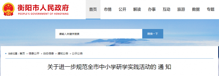 1月8日,衡阳市教育局、衡阳市文化旅游广电体育局联合发布《关于进一步规范全市中小学研学实践活动的通知》(以下简称《通知》),从加强组织管理、加强收费监管、加强宣传引导三个方面提出具体要求。
