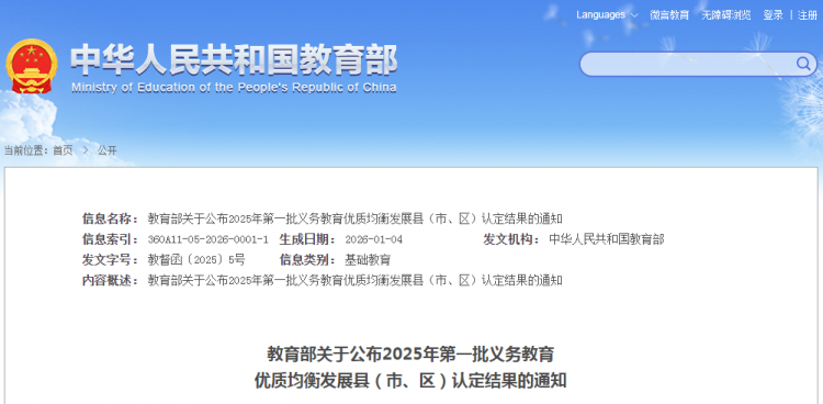 3.教育部公布2025年第一批义务教育优质均衡发展县(市、区)认定结果