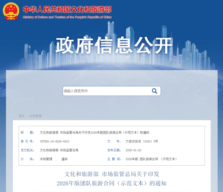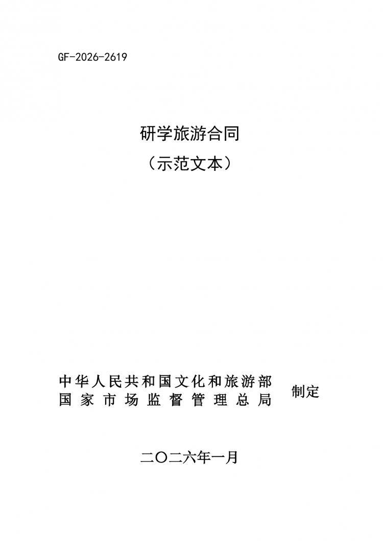 现将2026年版团队旅游合同(示范文本)印发给你们,请各地文化和旅游行政部门做好示范文本推行工作,会同市场监管部门引导规范旅行社合同行为,防范和纠正不公平格式条款,引导企业良性竞争,进一步优化旅游市场消费环境。本合同文本作为推荐性示范合同文本向社会公开,可登录文化和旅游部政府门户网站(https://www.mct.gov.cn)或市场监管总局政府门户网站(https://www.samr.gov.cn)自行下载。在推行、使用中若发现问题,要认真研究解决,并及时报告。