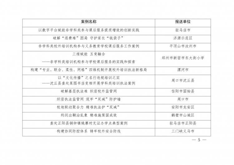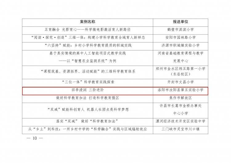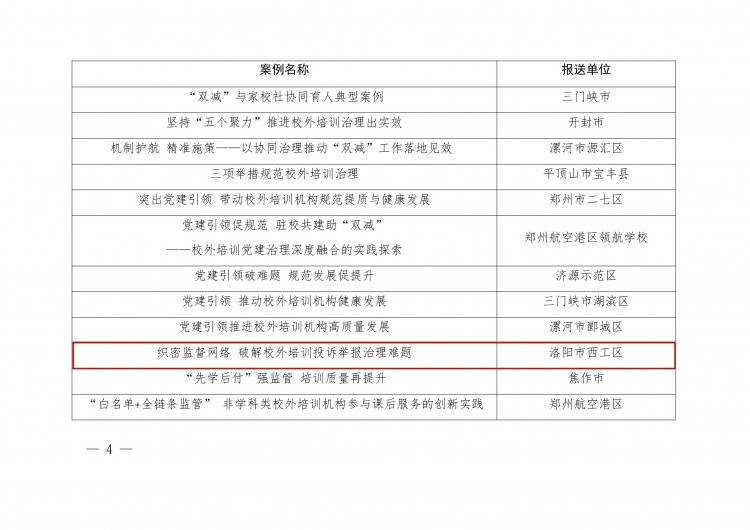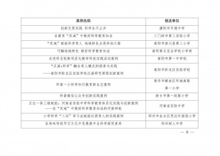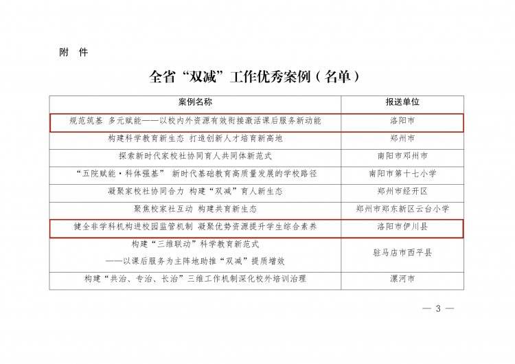 根据《河南省教育厅办公室关于征集评选“双减”及科学教育工作优秀案例的通知》有关要求,经各地推荐、专家评审、公示等环节,确定洛阳市教育局《规范筑基 多元赋能——以校内外资源有效衔接激活课后服务新动能》等86个案例为河南省“双减”及科学教育工作优秀案例,现将名单予以公布(见附件)。