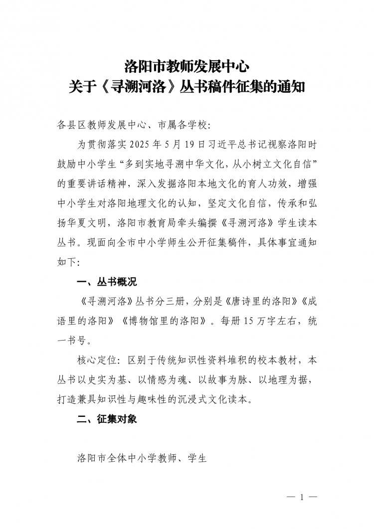 近日,洛阳市教师发展中心发布通知,面向全市中小学师生公开征集《寻溯河洛》丛书稿件,一起来看具体内容。