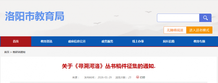 近日,洛阳市教师发展中心发布通知,面向全市中小学师生公开征集《寻溯河洛》丛书稿件。通知对丛书概况、征集对象、稿件要求、投稿方式及其他事项作出具体说明,投稿截止时间为2026年2月23日18:00。