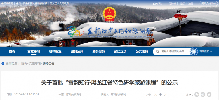 2月12日,黑龙江省文化和旅游厅发布《关于首批“雪韵知行·黑龙江省特色研学旅游课程”的公示》,经自主申报、地市文旅行政部门提报、专家集体评议、会议审议,80堂研学旅游课程入选首批省级“雪韵知行·黑龙江省特色研学旅游课程”,公示期为3个工作日。