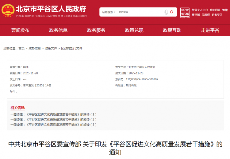 12月11日,北京市平谷区发布《平谷区促进文化高质量发展若干措施》(以下简称《若干措施》)。